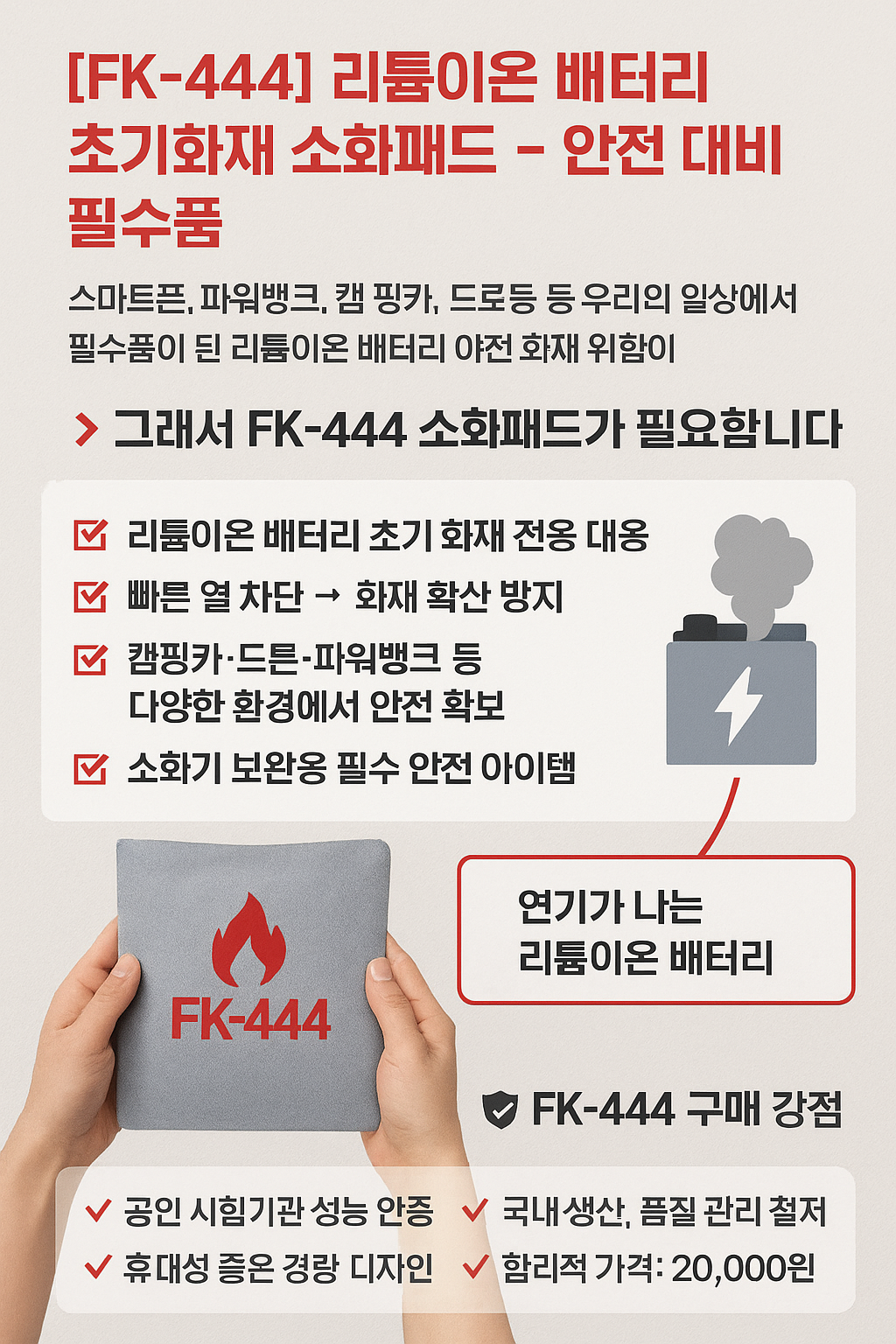 | [FK-444] 리튬이온 배터리 초기화재 소화패드 – 안전 대비 필수품 (0) | 2025.09.21 |